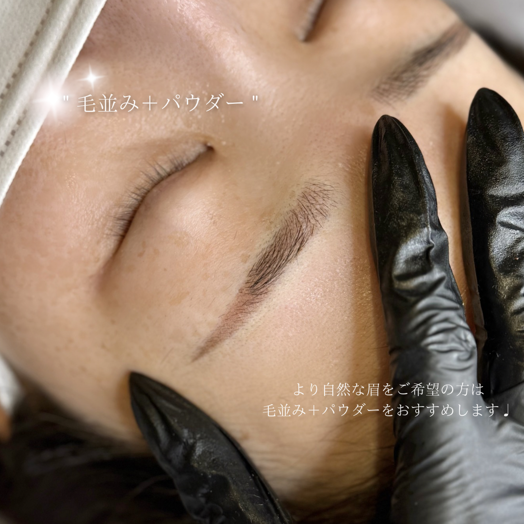 パウダー技法は、専用の機器を使って極細の色素粒子をグラデーション状に肌へ定着させる施術方法です。1本1本の毛を描くストローク技法と異なり、全体にふんわりとしたパウダーメイクのような均一感が生まれるため、50代以降の方に多い毛量の減少や左右差をナチュラルにカバーできます。また色素の深さや濃度を細かく調整することで、薄く抜け感のある仕上がりから、はっきりとした存在感のある眉まで幅広いデザインに対応できる点も大きな特長です。