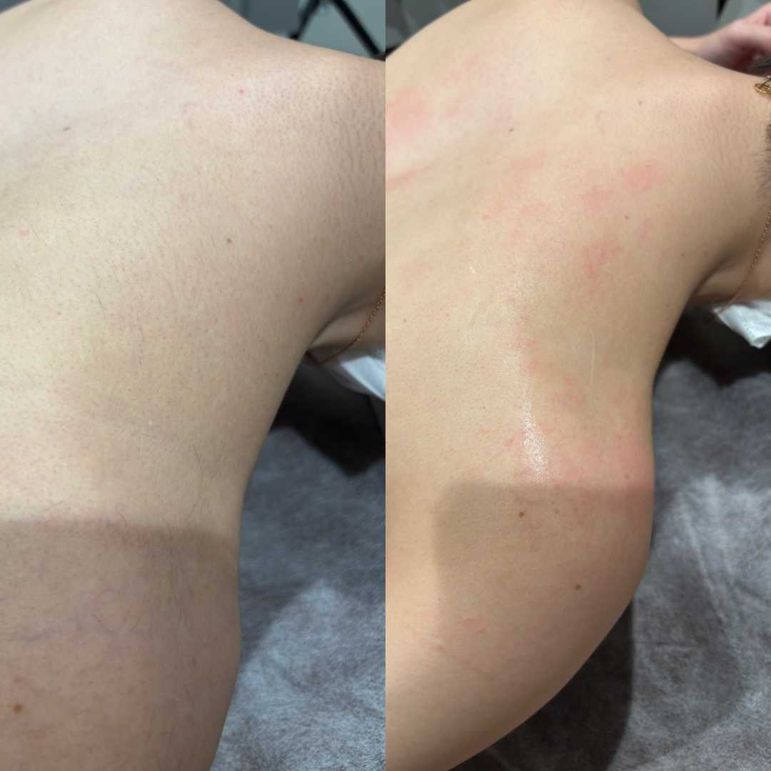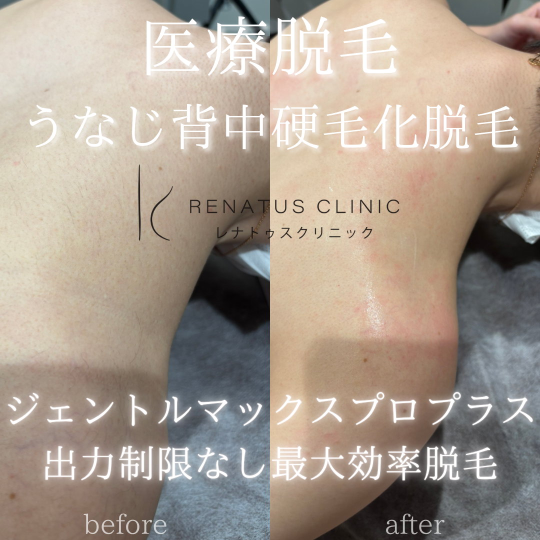 うなじ背中硬毛化にヤグレーザー医療脱毛した写真です。硬毛化の治し方には、ヤグレーザーが合う方と、パルス幅2msecのアレキサンドライトレーザーが効果のある方、自然に治る方がいます。ツルツルな仕上がりになるように、火傷などの副作用に注意しつつジェントルマックスプロプラスで高出力で重ね打ちをしました。
