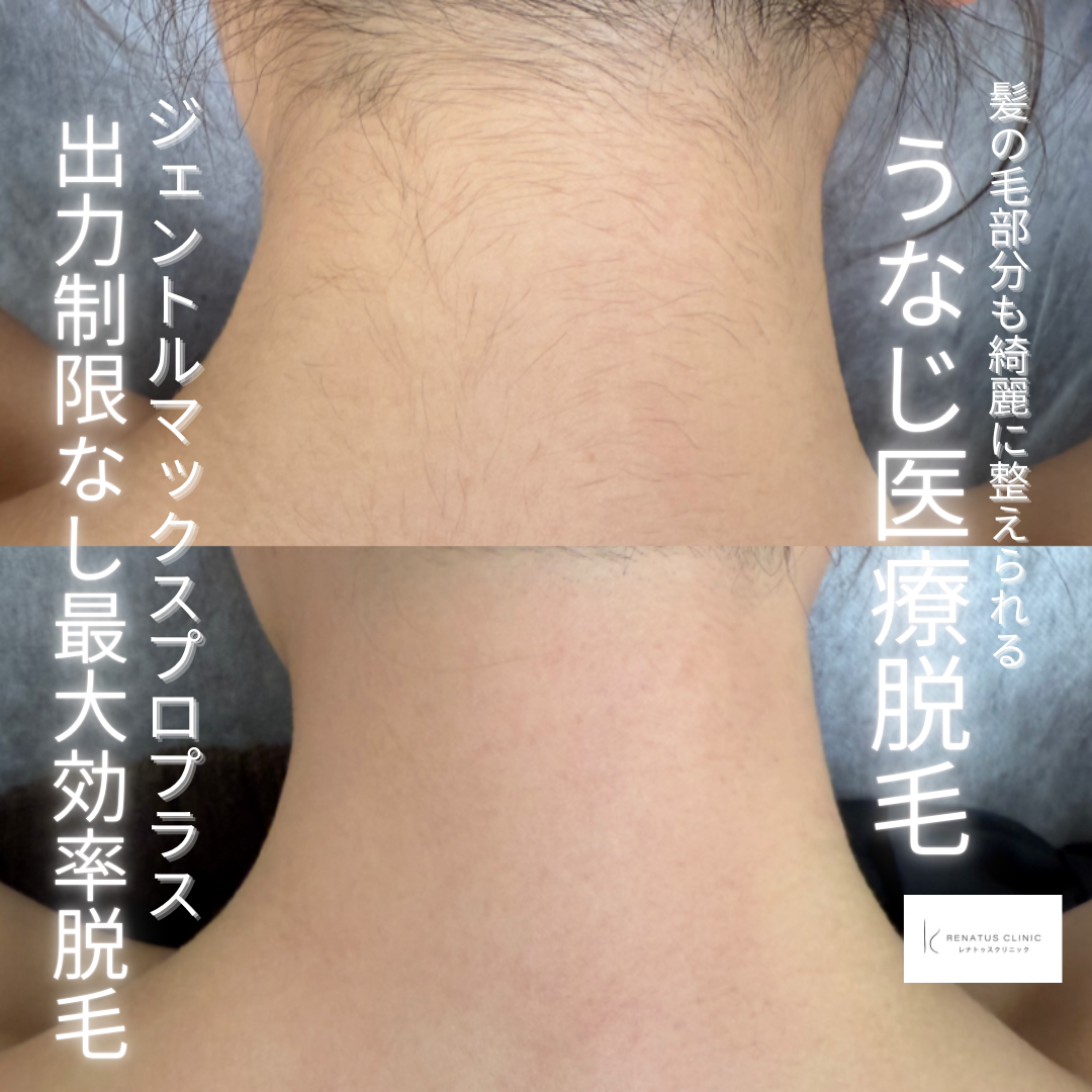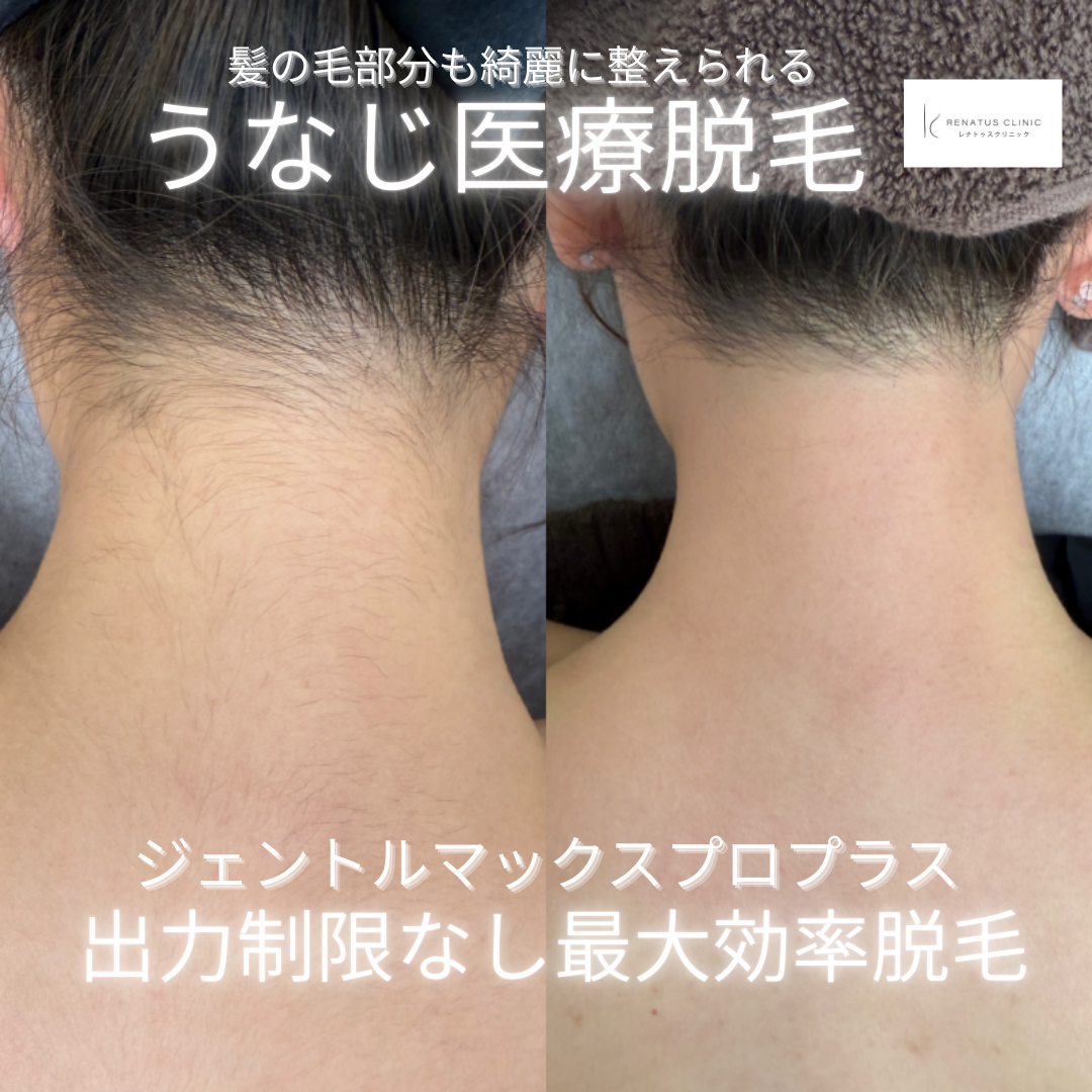 最新の医療脱毛機器ジェントルマックスプロプラスを使用しており、うなじの髪の毛部分の脱毛も非常に効果が高く、脱毛後の仕上がりがとても綺麗になります。