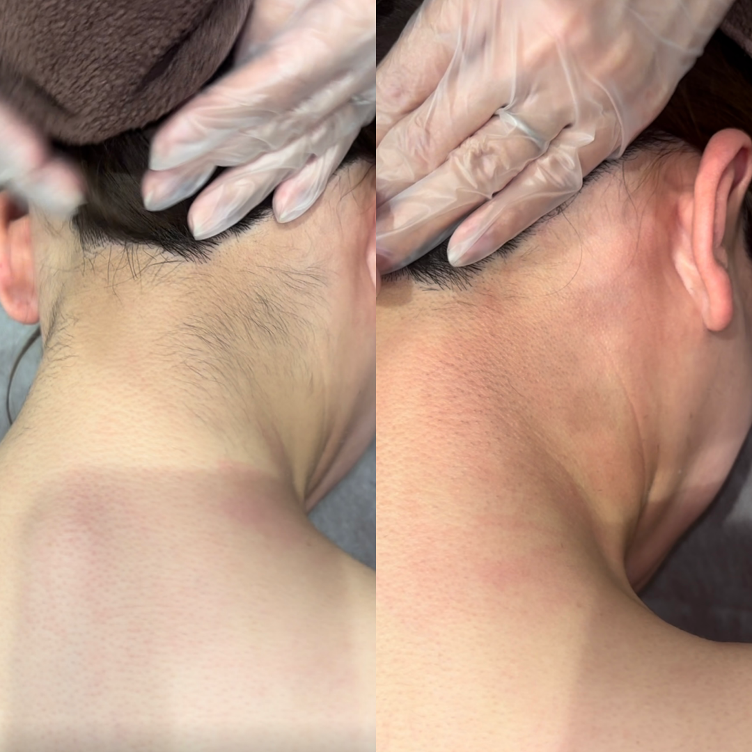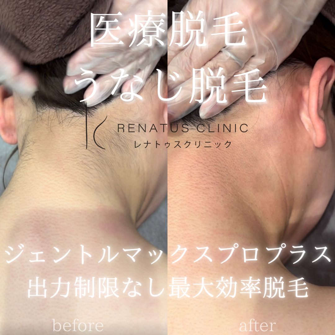 新宿で医療脱毛うなじデザインするならレナトゥスクリニックがおすすめ。人気のMW型、W型、U型からあなたにあったデザインを提案しデザインします。ツルツルな仕上がりになるように、火傷などの副作用に注意しつつジェントルマックスプロプラスで高出力で重ね打ちをしました。