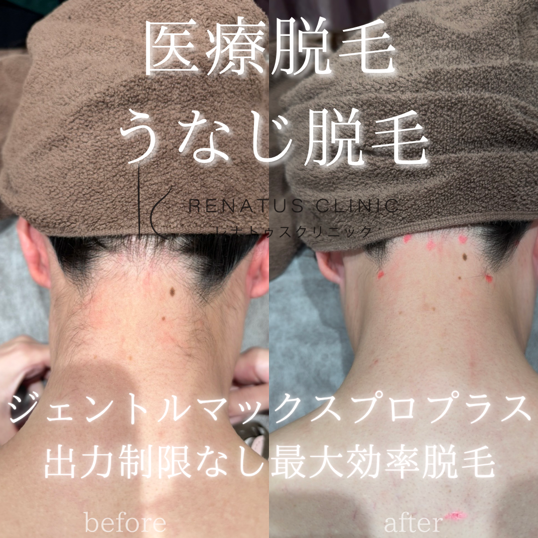 名古屋でうなじ医療脱毛なら髪の毛部分まで形を整えられるレナトゥスクリニック名古屋院へ。シェービングより安い料金でツルツルな仕上がりになるように、火傷などの副作用に注意しつつジェントルマックスプロプラスで高出力で重ね打ちをしました。
