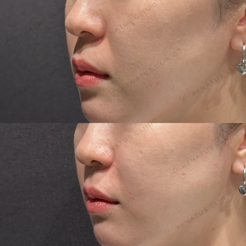 鼻翼基部の凹みが改善するように処置しました。