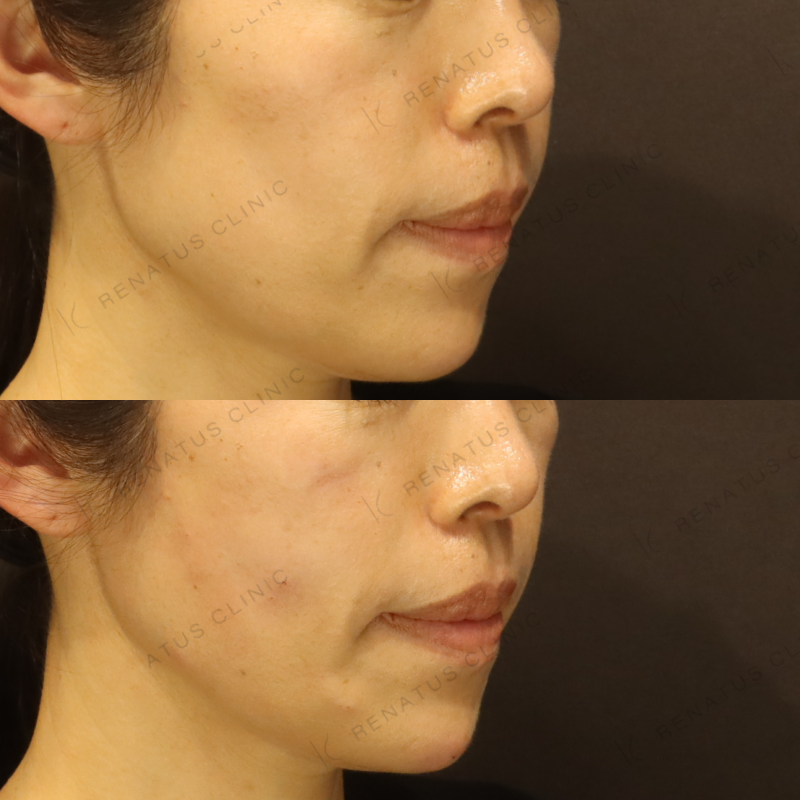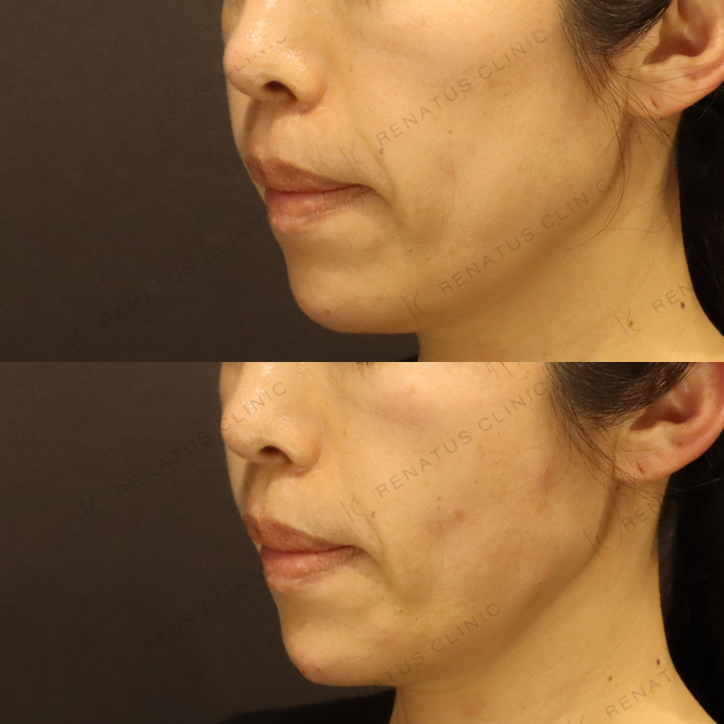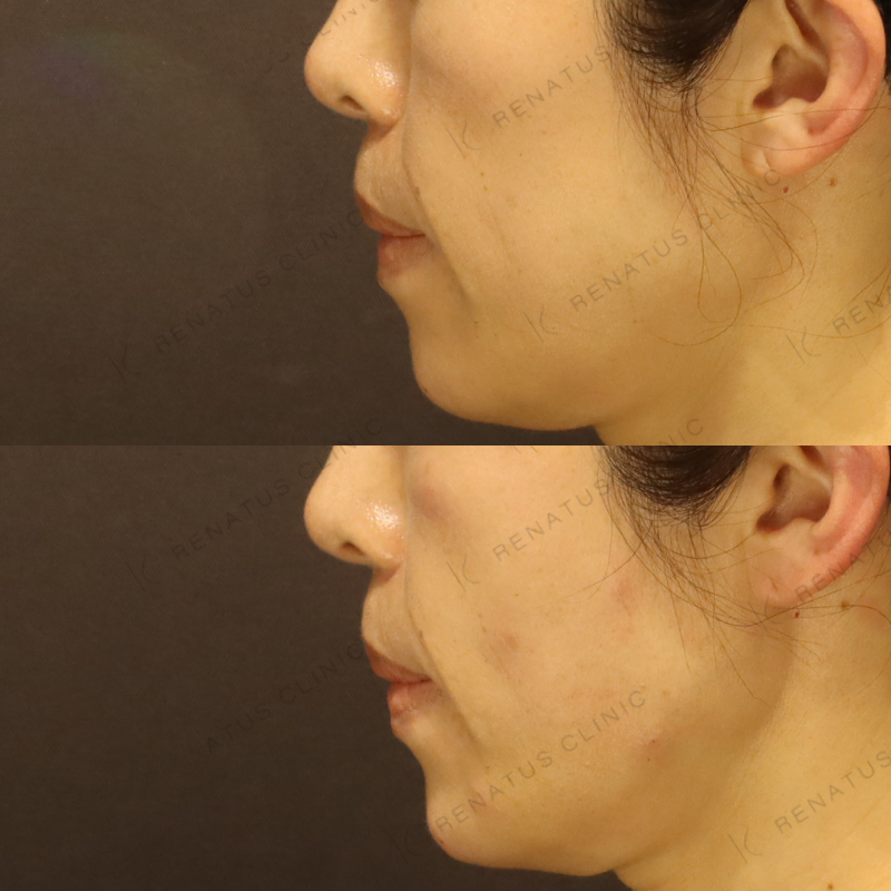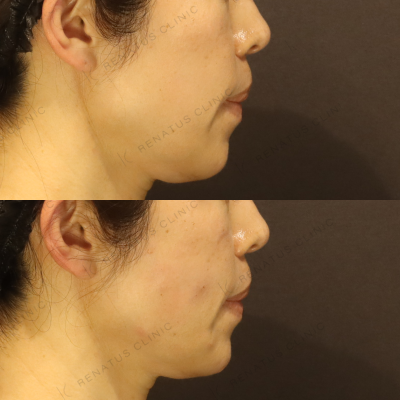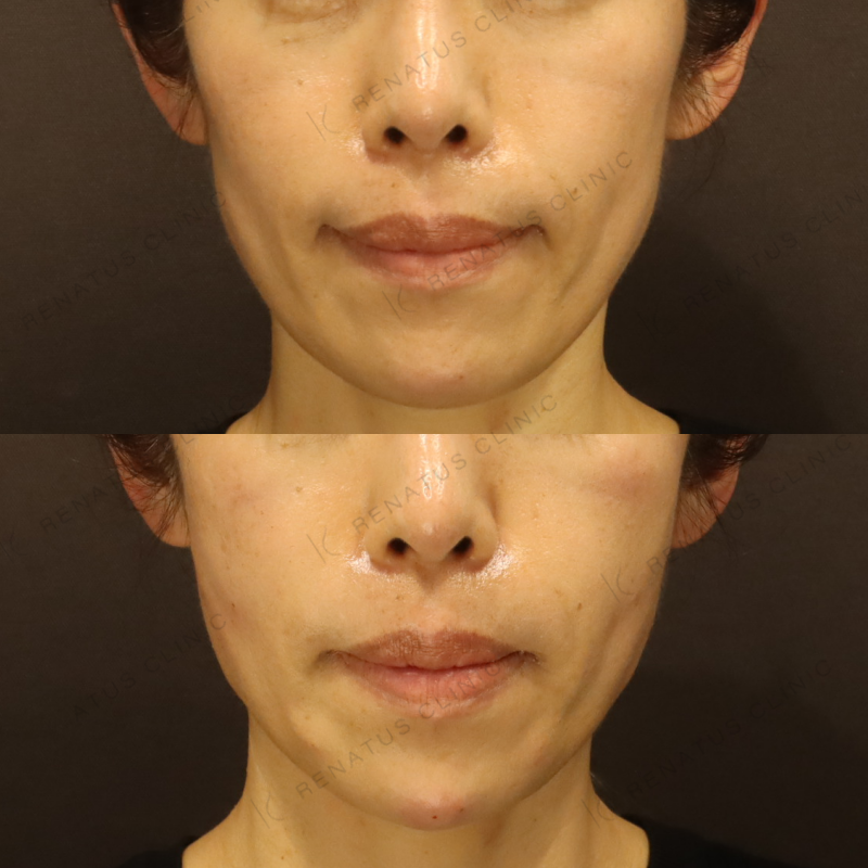 今回はピネハ(ダイヤモンドフィール)を使用し、頬の骨格に沿った深層への注入で、たるみによる平坦化を立体的に改善しました。ピネハは高い凝集性と柔軟性を兼ね備えた製剤で、頬骨下の脂肪層が減少しやすい40代の方に特に適しており、過剰な膨らみを出さず自然なボリューム回復が可能です。注入量と注入層を細かくコントロールすることで、左右差にも丁寧に対応し、患者様本来の骨格美を引き出す仕上がりを目指しています。