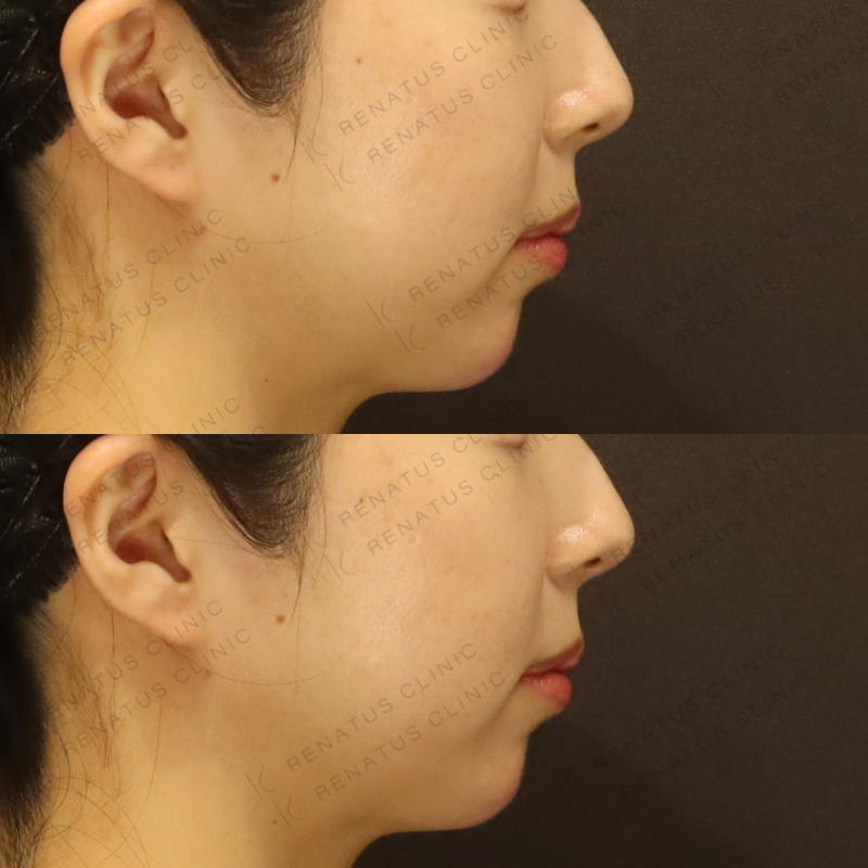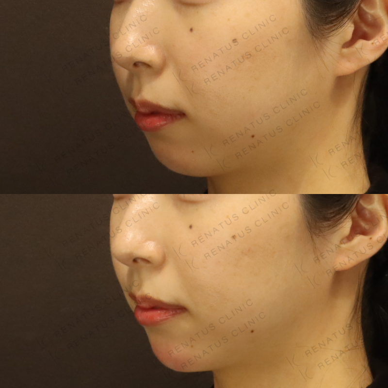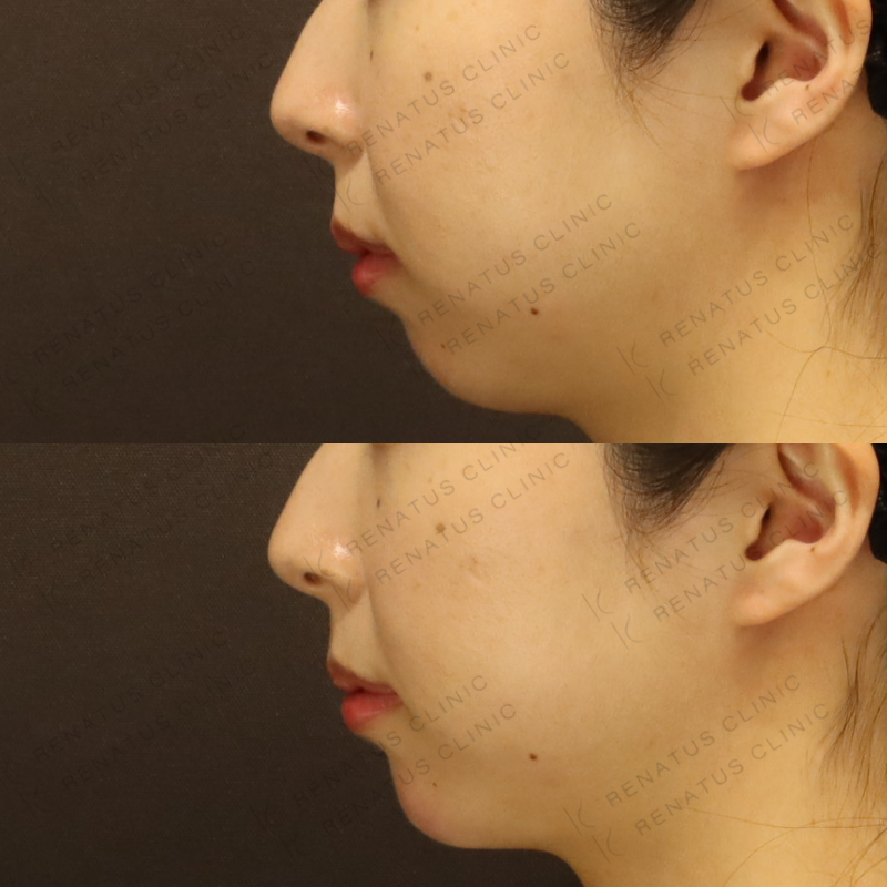 今回の施術では、持続期間が長く高い形状維持力を持つヒアルロン酸製剤「ボラックス(VOLUX)」を使用し、顎先に適切な高さと前方への突出感を付与することで、横顔の美しいラインを形成しました。注入層を骨膜直上に精密にコントロールすることで、不自然な横広がりを防ぎながら、理想的なEラインに近づけています。お一人おひとりの顎の骨格・皮膚の厚みを丁寧に見極めたカウンセリングを経て、その方の顔立ちに馴染む自然な仕上がりを目指しています。
