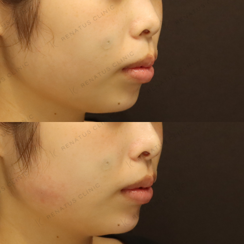 A:個人差はありますが、腫れや内出血は施術後2〜5日程度で落ち着くことが多いです。施術当日は注入部位への強い圧迫や激しい運動、飲酒は避けてください。また、施術後1週間は顎を強く触ったりマッサージしたりすることを控えていただくと、製剤が定着しやすくなります。