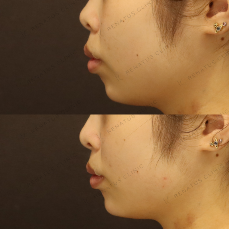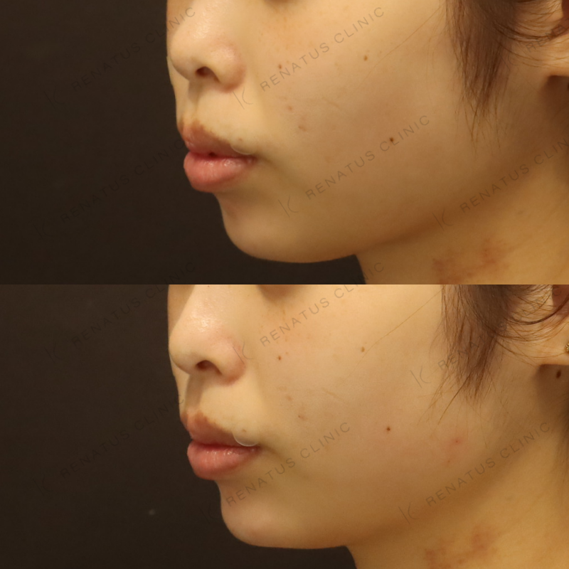 今回はボラックス(VOLUX)を使用し、10代女性の顎先に自然なシャープさと縦方向の高さを同時に付与しました。ボラックスは高い硬度と弾力性を持ち、顎のように動きが少ない部位への定着性に優れ、約18〜24か月の持続が期待できる製剤です。注入層と注入量を精密にコントロールすることで、正面・側面いずれから見ても整ったEラインに仕上げることを意識しています。