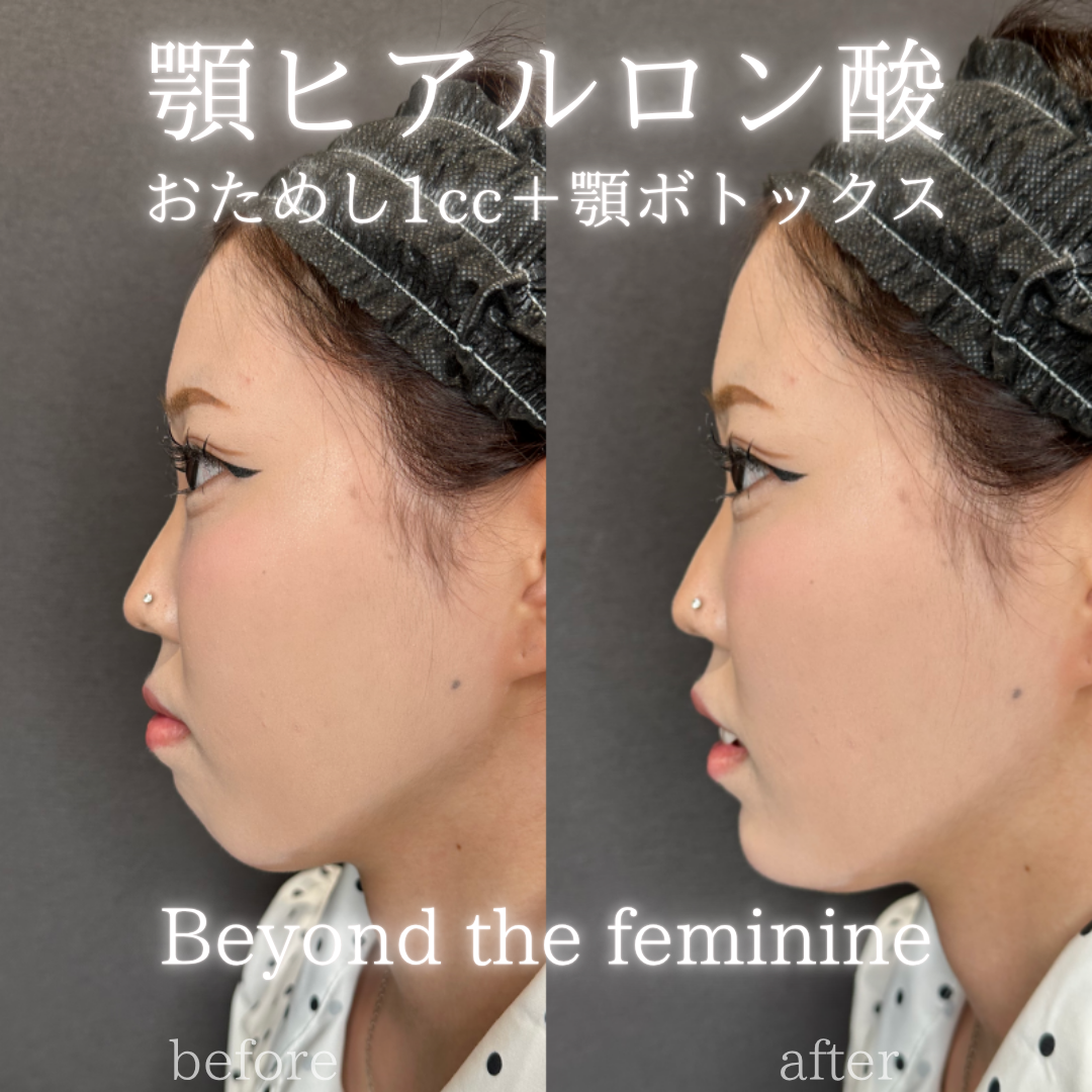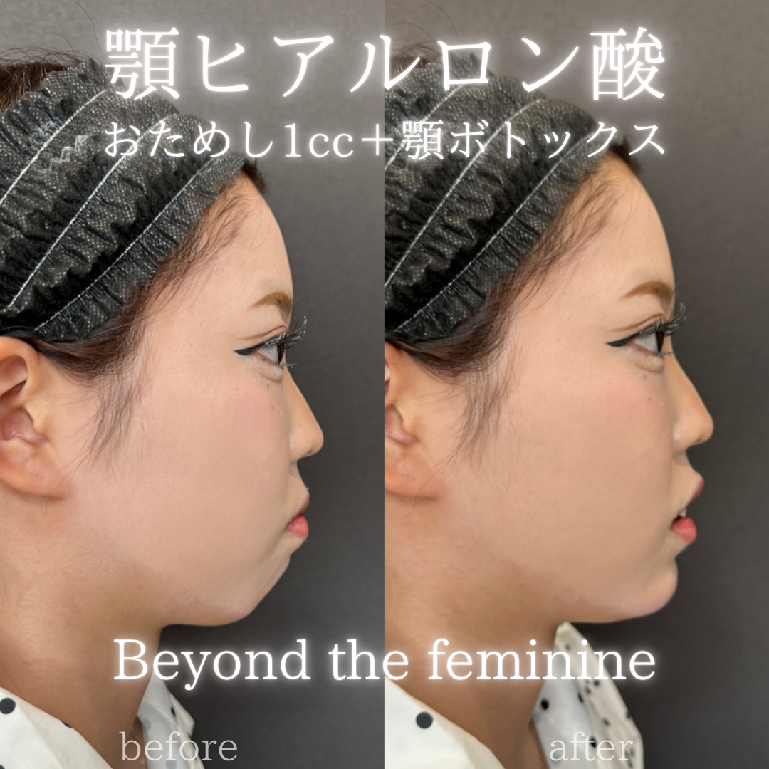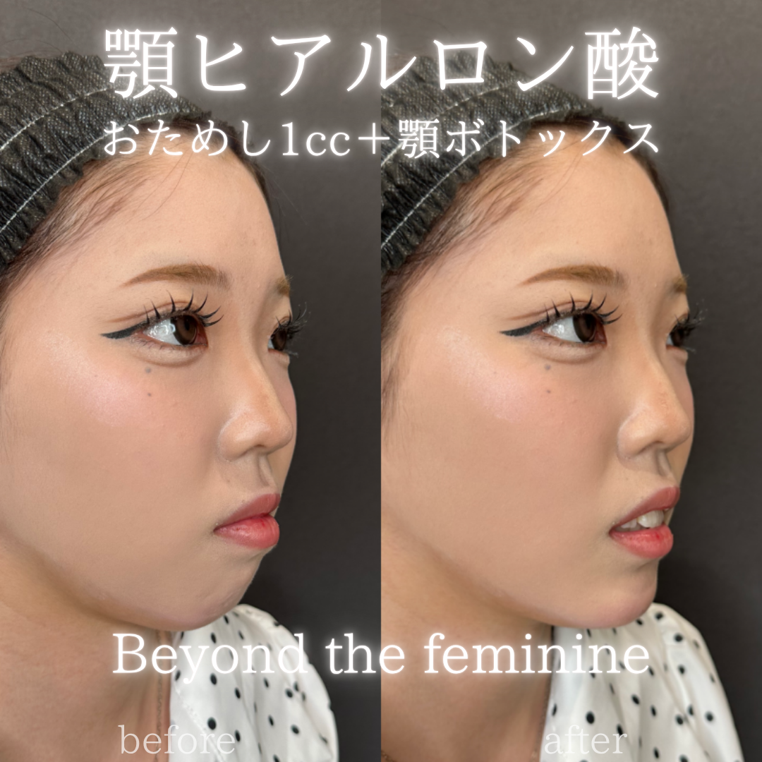 今回使用したダイヤモンドフィール/ピネハは、適度な硬度と柔軟性を兼ね備えた製剤で、顎先のシャープな輪郭形成に非常に適しています。注入の際は骨膜上への正確な層コントロールを意識し、左右対称の自然なEラインが生まれるよう丁寧に量と位置を調整しました。10代の患者様はお顔の成長過程にあるため、将来のバランスも考慮したデザインを心がけています。