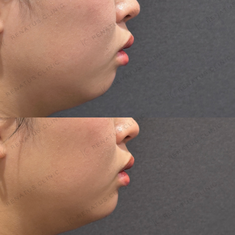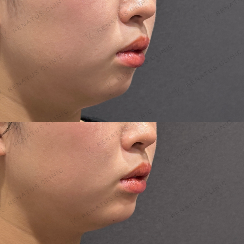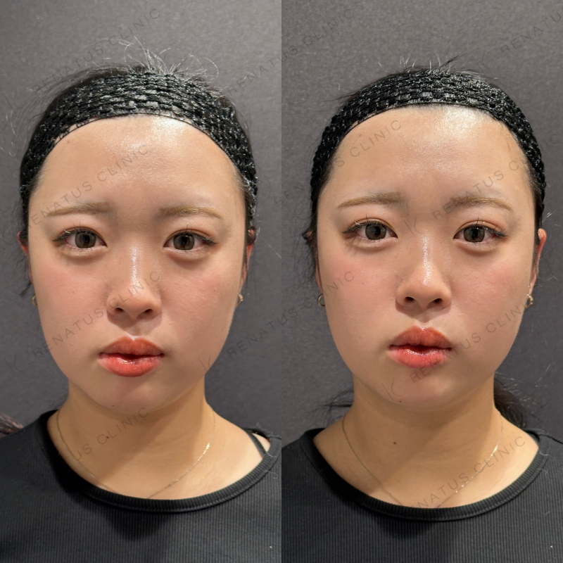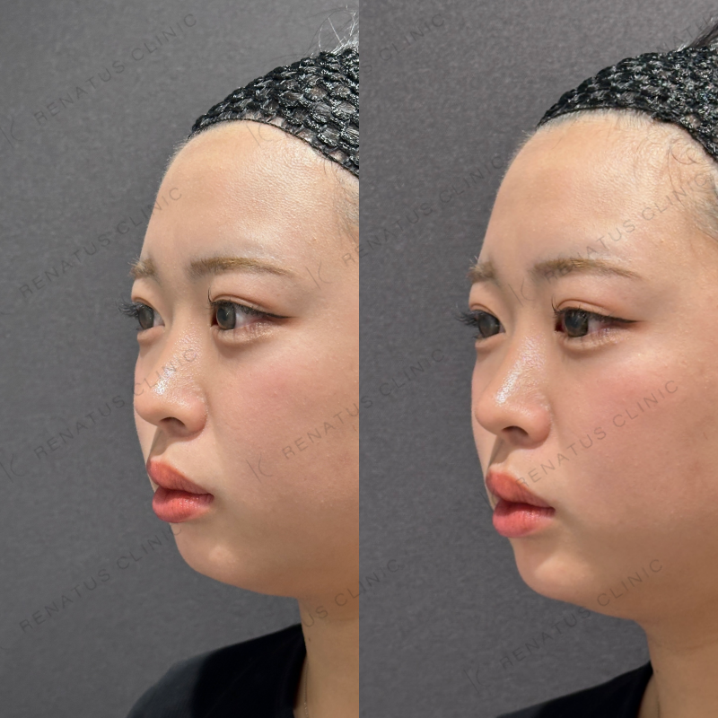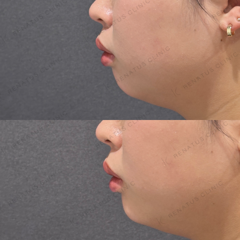 今回はダイヤモンドフィール・ピネハを組み合わせ、顎先にしっかりとしたプロジェクションと自然なシャープさを同時に表現しました。ダイヤモンドフィールは高い弾力性でリフト力を担い、ピネハは柔軟性に優れるため皮膚の薄い顎先でもなじみよく仕上がります。注入層・注入量を細かくコントロールすることで、正面・横顔どちらからも美しいEラインを追求しています。
