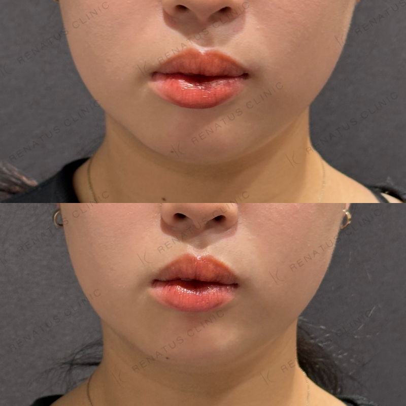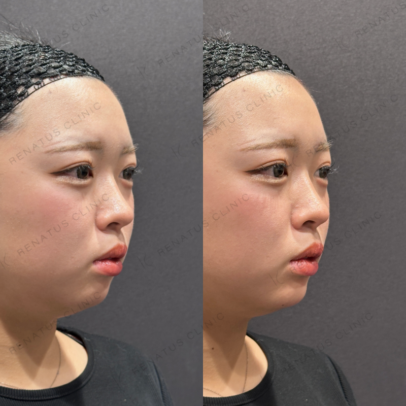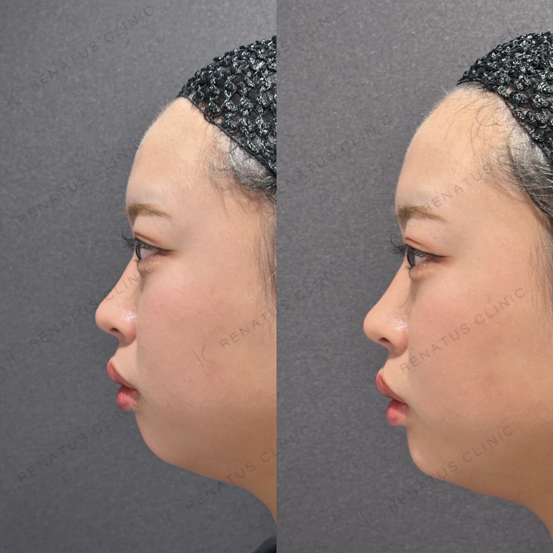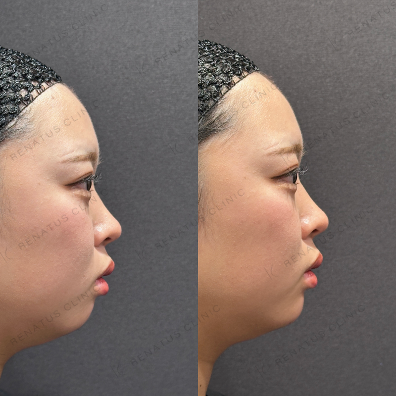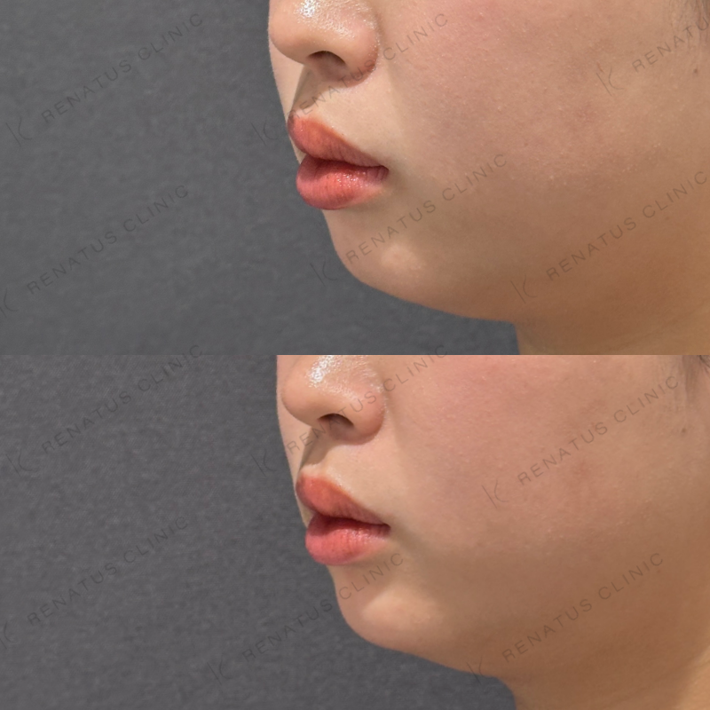 今回はダイヤモンドフィール・ピネハを組み合わせ、顎先にしっかりとしたプロジェクションと自然なシャープさを同時に表現しました。ダイヤモンドフィールは高い弾力性でリフト力を担い、ピネハは柔軟性に優れるため皮膚の薄い顎先でもなじみよく仕上がります。注入層・注入量を細かくコントロールすることで、正面・横顔どちらからも美しいEラインを追求しています。