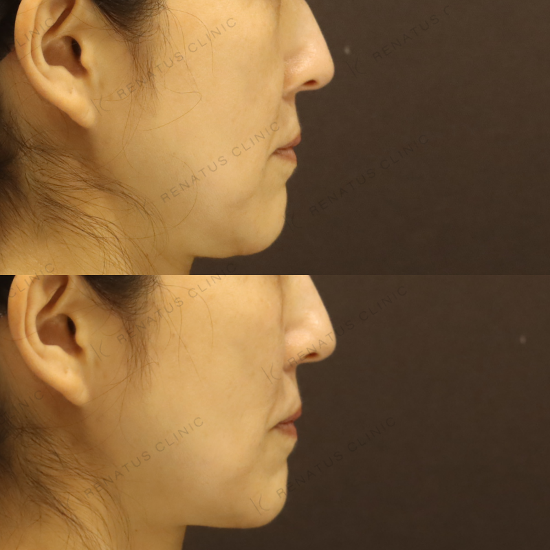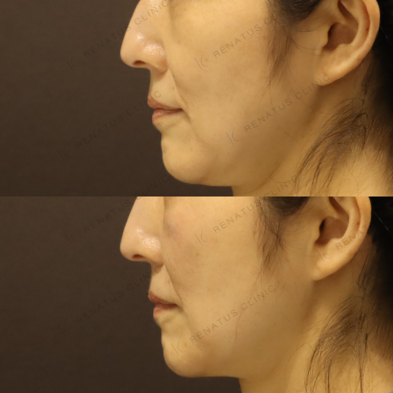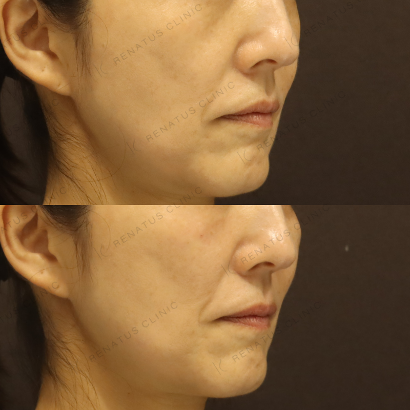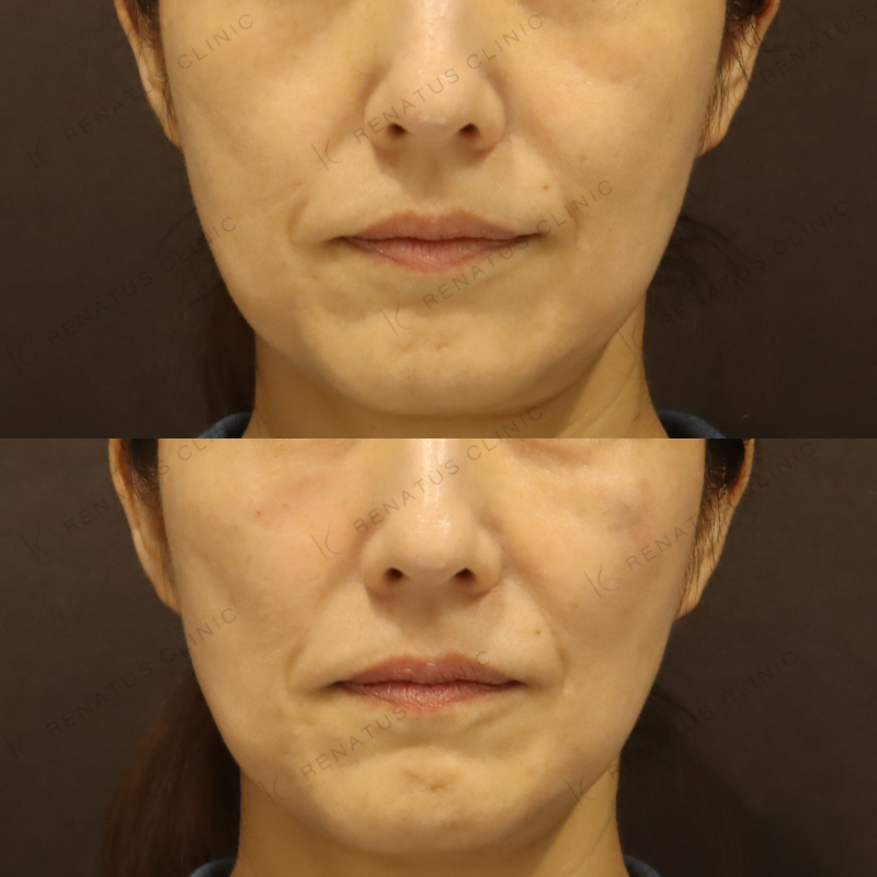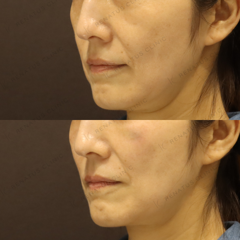 ゴルゴラインの治療では、ヒアルロン酸製剤の粘度・弾力性の違いを正確に見極め、深層から表層まで注入層を丁寧にコントロールすることが自然な仕上がりの鍵となります。今回使用したダイヤモンドフィールは高い引き上げ力と持続性を持ち、ピネハは繊細な輪郭補正に優れているため、この2製剤を組み合わせることで頬全体のボリュームバランスを整えながら溝を目立たなくすることができます。50代の方は皮膚の厚みや骨格の変化も考慮した上で注入設計を行うことで、不自然な膨らみを出さない若々しい印象へと導いています。