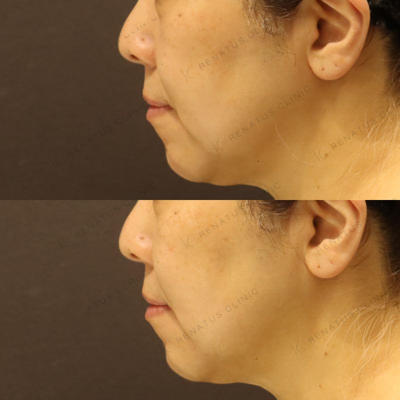 今回はボルベラ(VOLBELLA)を使用し、50代女性のゴルゴラインとほうれい線にアプローチしました。ボルベラは柔らかくなじみやすい特性を持つため、表情を動かしても不自然になりにくく、繊細な部位への注入に非常に適した製剤です。注入層と注入量を細かくコントロールすることで、年齢とともに生じた凹みを自然にふっくらと補い、周囲の組織との調和を大切にしながら仕上げることを常に意識しています。