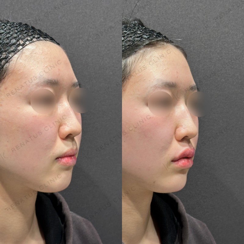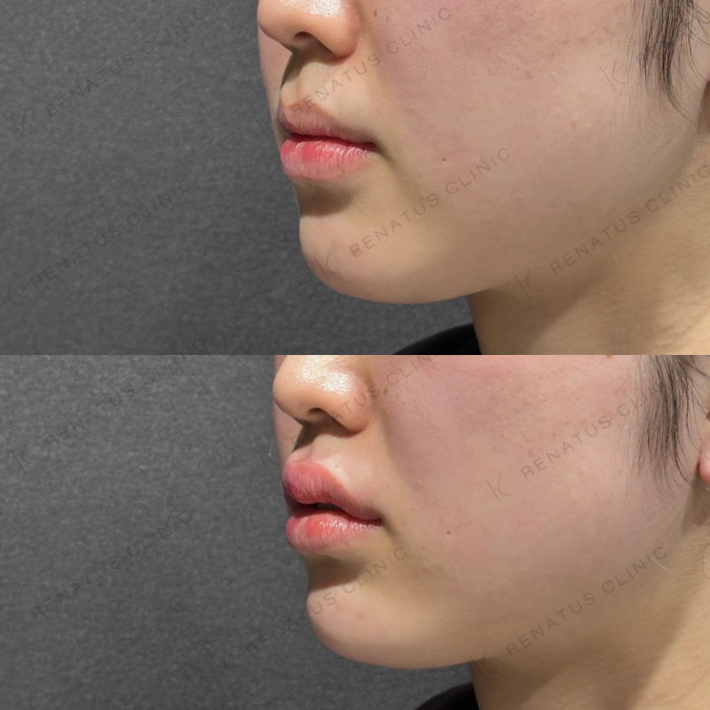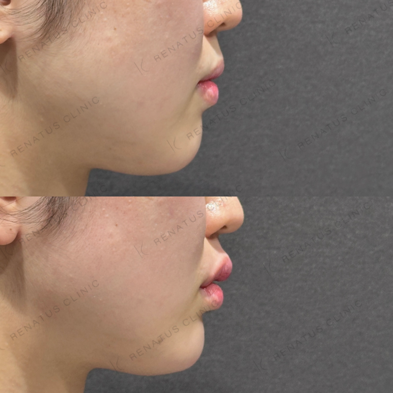 今回はボルベラ(VOLBELLA)を使用し、唇のふっくら感と顎のシャープなラインを同時に整えました。ボルベラはジュビダームシリーズの中でも粒子が細かく柔軟性に優れており、唇のような動きのある部位や顎先の繊細なシェイピングに非常に適した製剤です。注入層と注入量を部位ごとに丁寧にコントロールすることで、触れても違和感のない自然な仕上がりを追求しています。