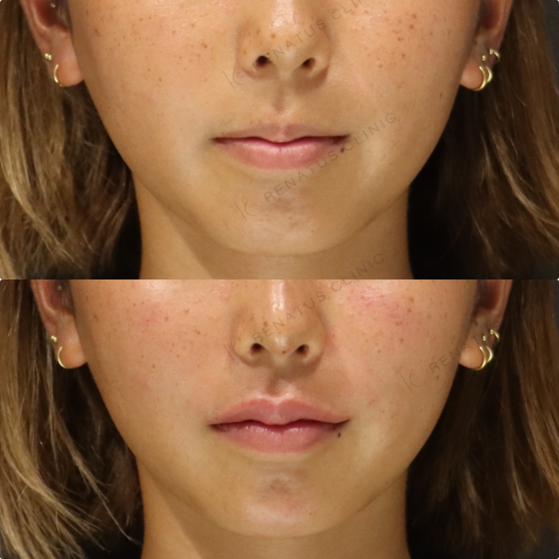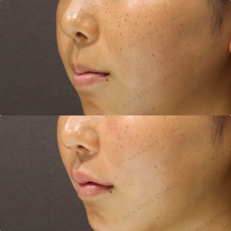 今回はボルベラ(VOLBELLA)を使用し、10代女性のほうれい線と唇のボリューム感を自然に整えました。ボルベラは非常に柔らかく滑らかなゲル構造が特徴で、唇や浅い層への注入に適した製剤です。注入深度と量を細かくコントロールすることで、腫れを最小限に抑えつつ、年齢に合った繊細な仕上がりを実現しています。