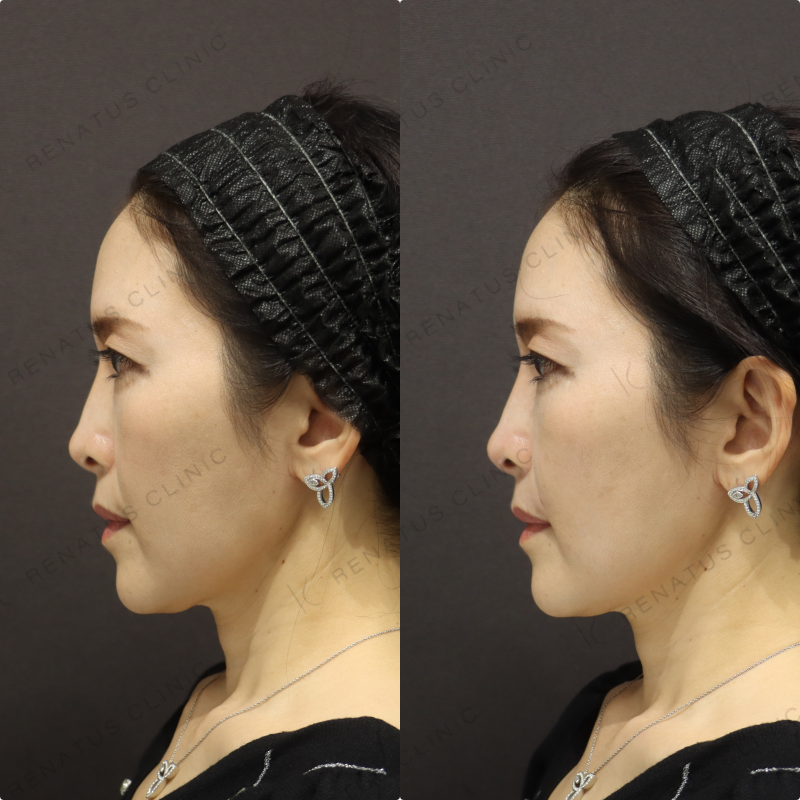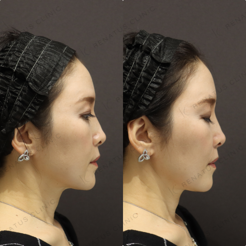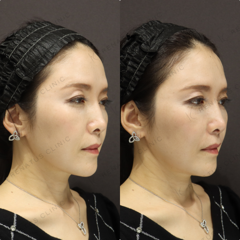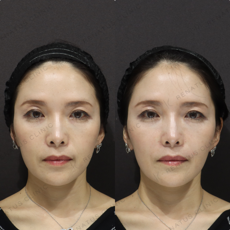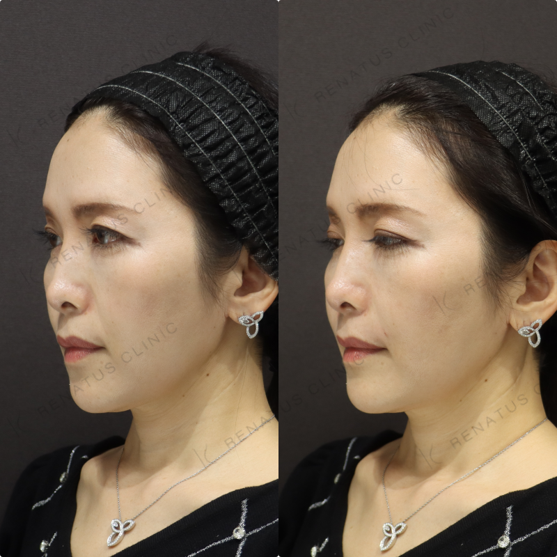 今回はボリフト(VOLIFT)を使用し、ほうれい線と鼻翼基部へのアプローチを組み合わせることで、40代女性特有の立体的なたるみを自然なボリュームで補正しました。ボリフトはアラガン社製のヴィスクロス技術による中程度の硬さを持つ製剤で、深い層への注入に適しており、持続期間は約12〜18か月と長期的な効果が期待できます。注入量・層・ポイントを細かく調整することで、不自然な膨らみを出さず、若々しくも自然な仕上がりを実現することを最も大切にしています。