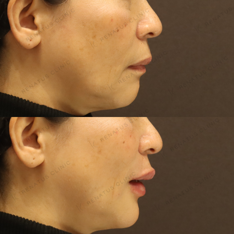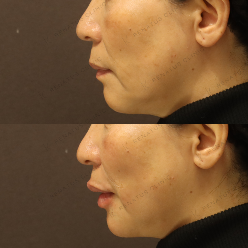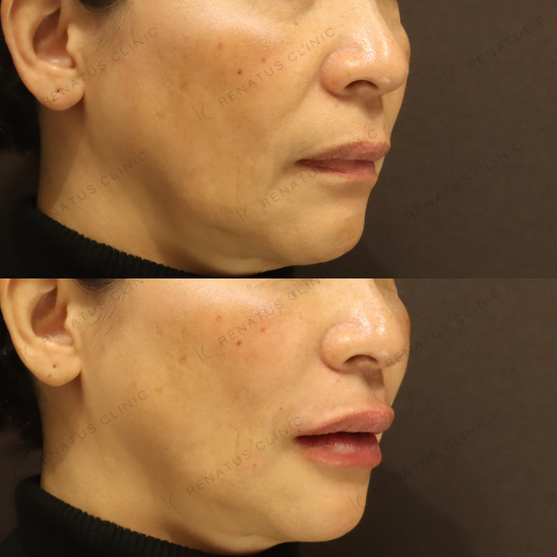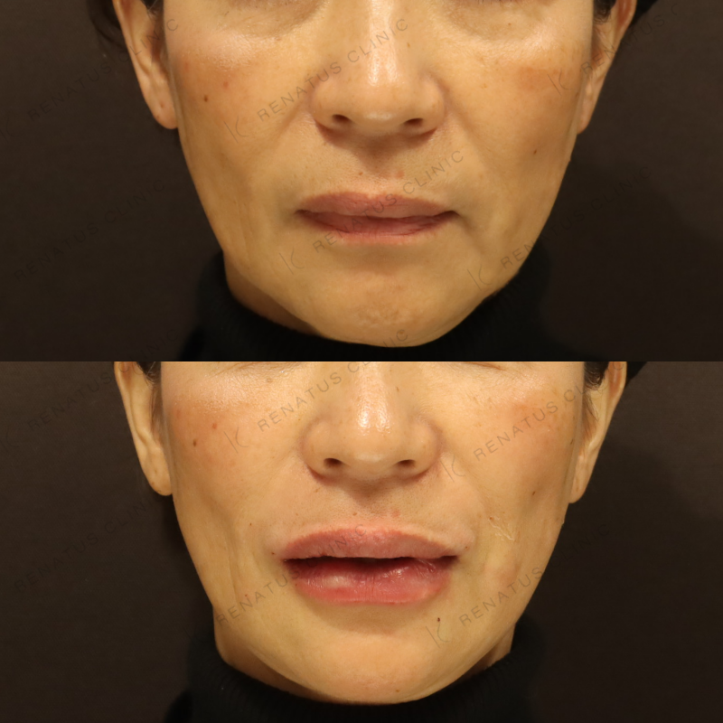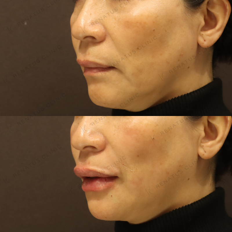 今回はボルベラ(VOLBELLA)を使用し、50代女性のほうれい線と唇のボリュームロスに対してアプローチしました。ボルベラはジュビダームシリーズの中でも特に粒子が細かく柔らかい設計のため、皮膚の薄い唇や浅い層へのなじみが非常に優れており、不自然な硬さや凹凸が出にくいのが特徴です。注入量・注入深度をミリ単位でコントロールしながら、加齢による立体感の低下を自然なボリュームで補い、「若返った」ではなく「もともとこうだった」と感じていただけるような仕上がりを目指しています。