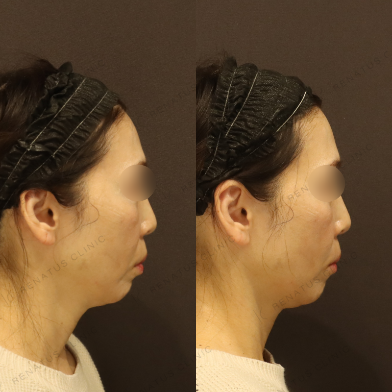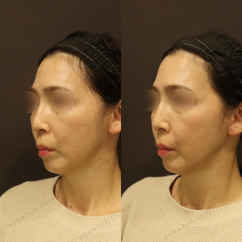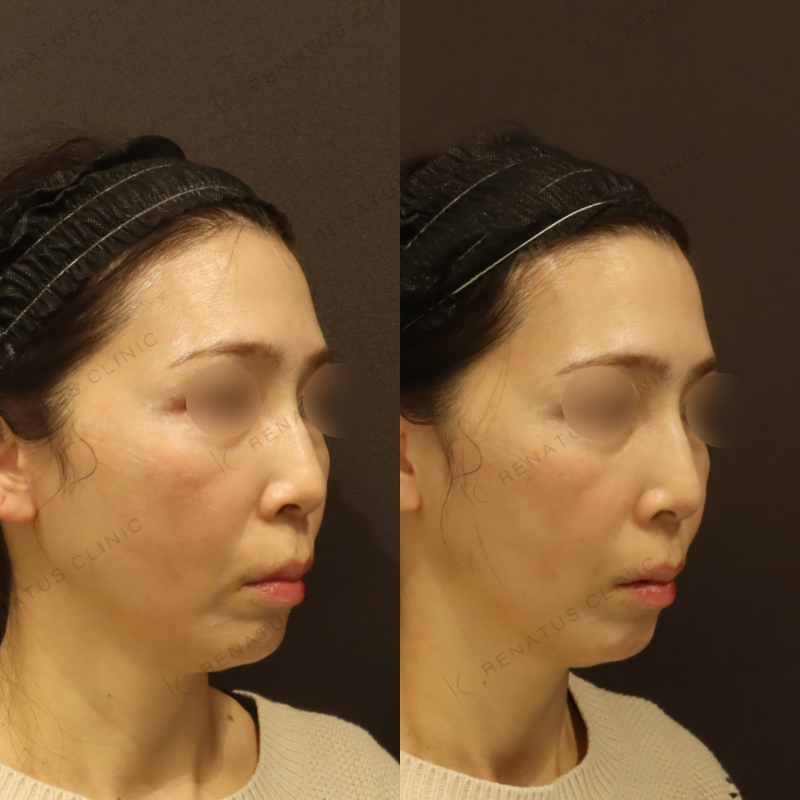 ほうれい線へのヒアルロン酸注入には、製剤の硬さや粘度の選択が仕上がりの自然さを大きく左右します。当院では、柔軟性が高く皮膚なじみに優れたダイヤモンドフィールと、高い保水力で深いシワにも対応できるピネハを組み合わせ、層ごとに注入量と深度を細かくコントロールすることで過剰な膨らみのない自然な若返りを実現しています。50代の骨格変化や脂肪の移動なども考慮した立体的なデザインを心がけており、施術後も表情を妨げない仕上がりを追求しています。