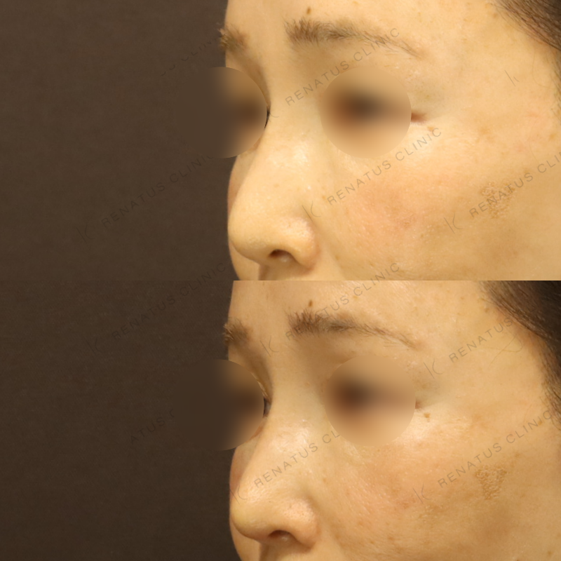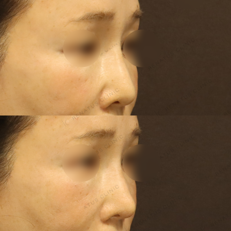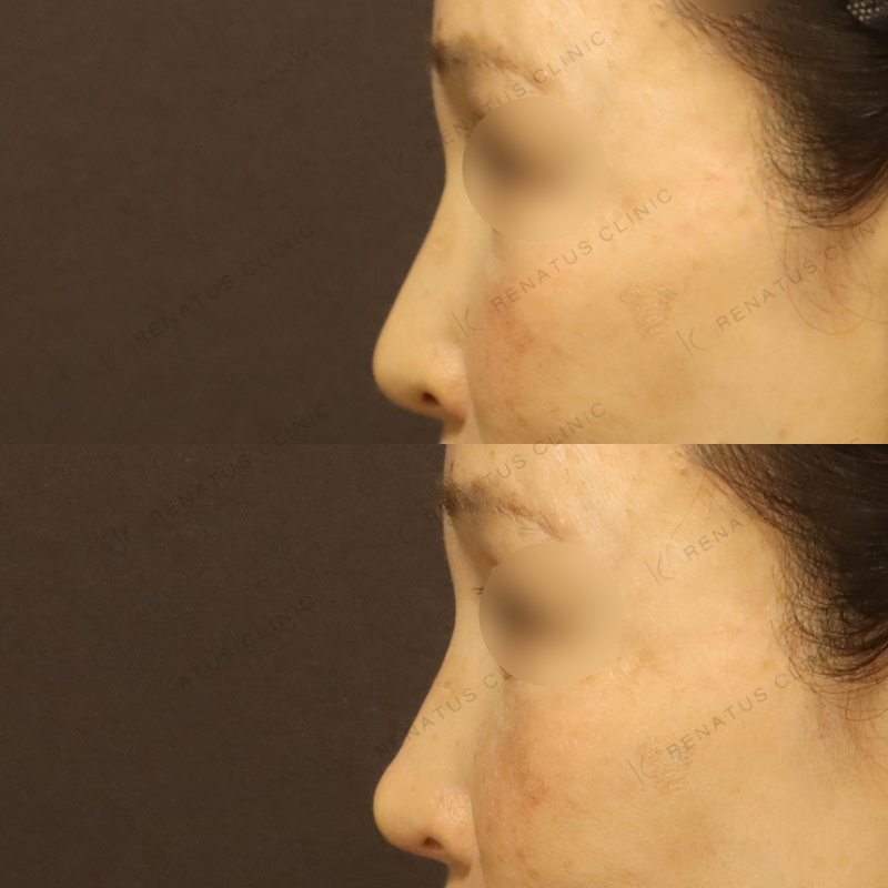 今回はボラックス(VOLUX)を使用した50代女性の鼻ヒアルロン酸注入を担当しました。ボラックスは高い粘弾性と優れた形状保持力を持つ製剤で、鼻筋・鼻根部への注入に非常に適しており、18ヶ月以上の持続が期待できるのが大きな特徴です。年齢を重ねた肌でも浮きや不自然さが出にくいよう、注入層と量を精密にコントロールすることで、顔全体のバランスに馴染む自然な高さを目指しています。