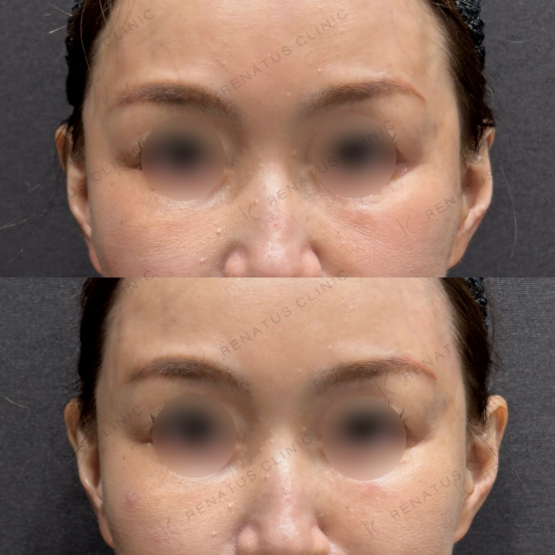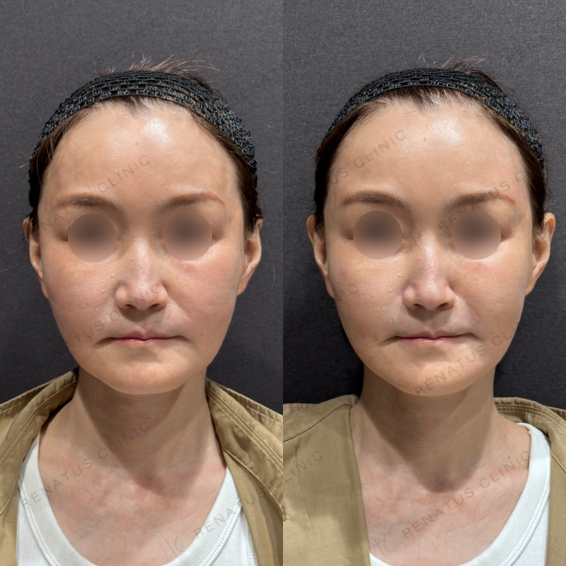 こめかみの凹みが改善するように処置しました。