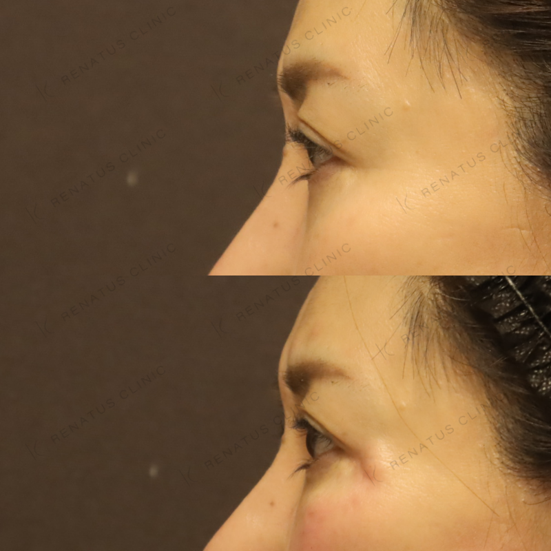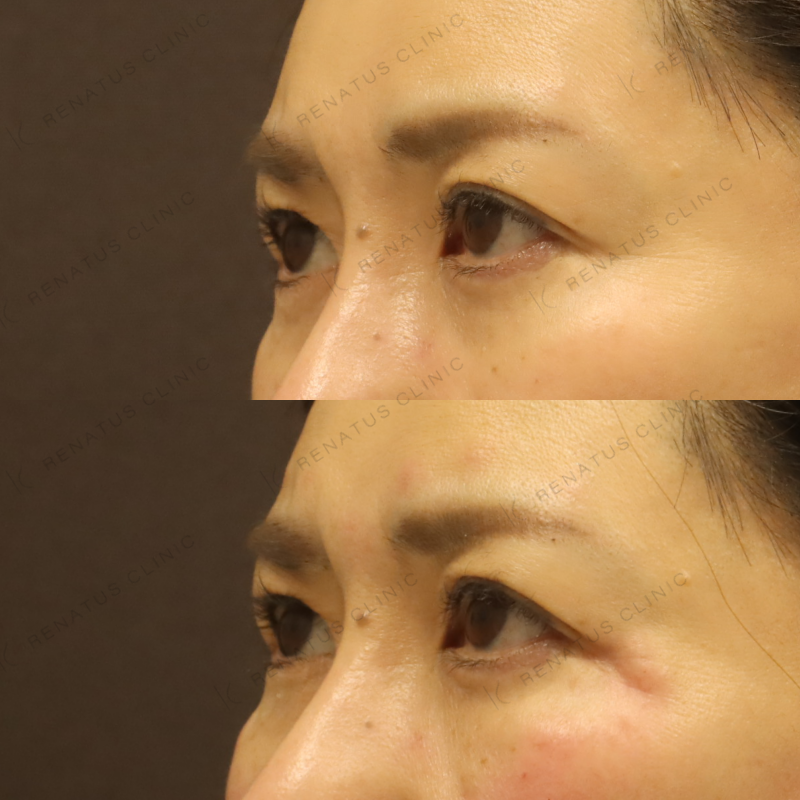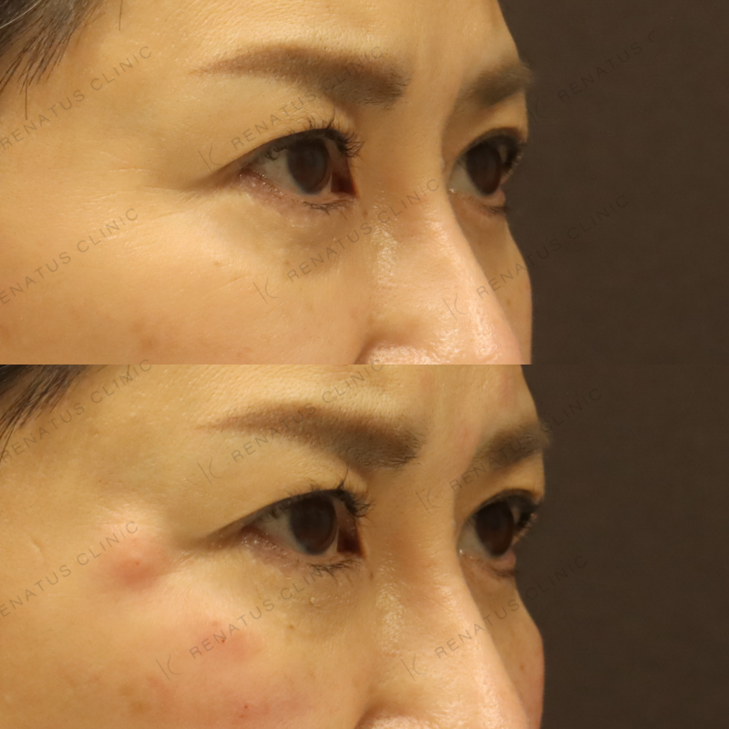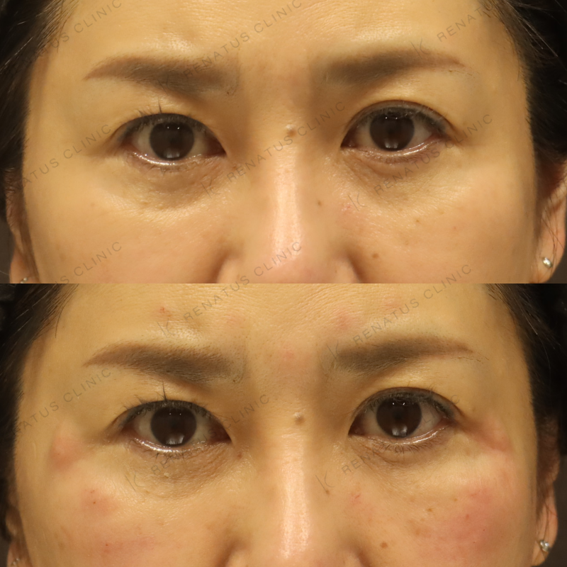 目の下の眼窩縁は皮膚が非常に薄く、使用する製剤の選定と注入層のコントロールが仕上がりを大きく左右します。今回はアラガン社のボルベラ(VOLBELLA)を使用しました。ボルベラは柔軟性が高くなめらかなゲルで、繊細なデリケートゾーンへの注入に適しており、ツンとしたふくらみや青み(チンダル現象)が出にくい設計になっています。50代の患者様の骨格・脂肪の萎縮バランスを丁寧に見極め、涙袋から眼窩縁にかけて段差をなだらかに整えることで、目元全体に自然な若々しさを取り戻すことができました。