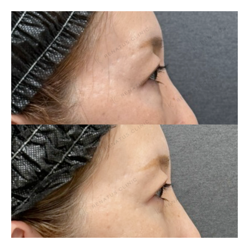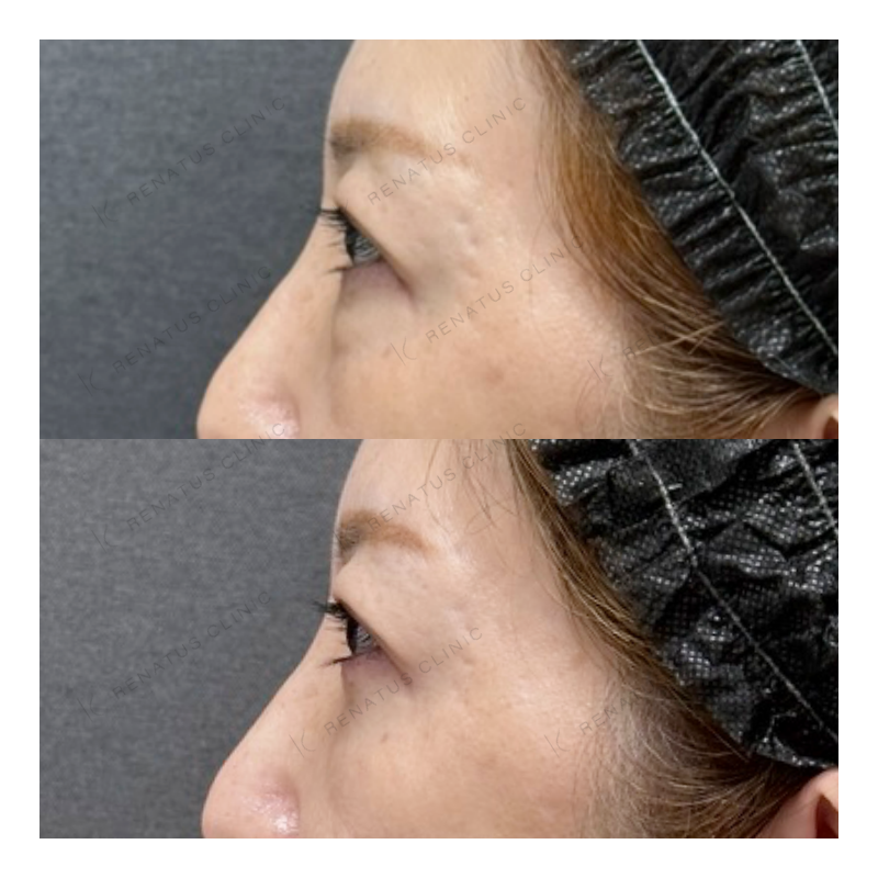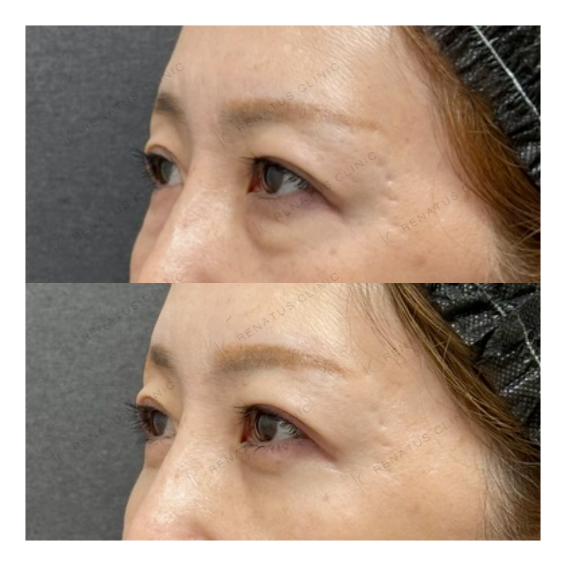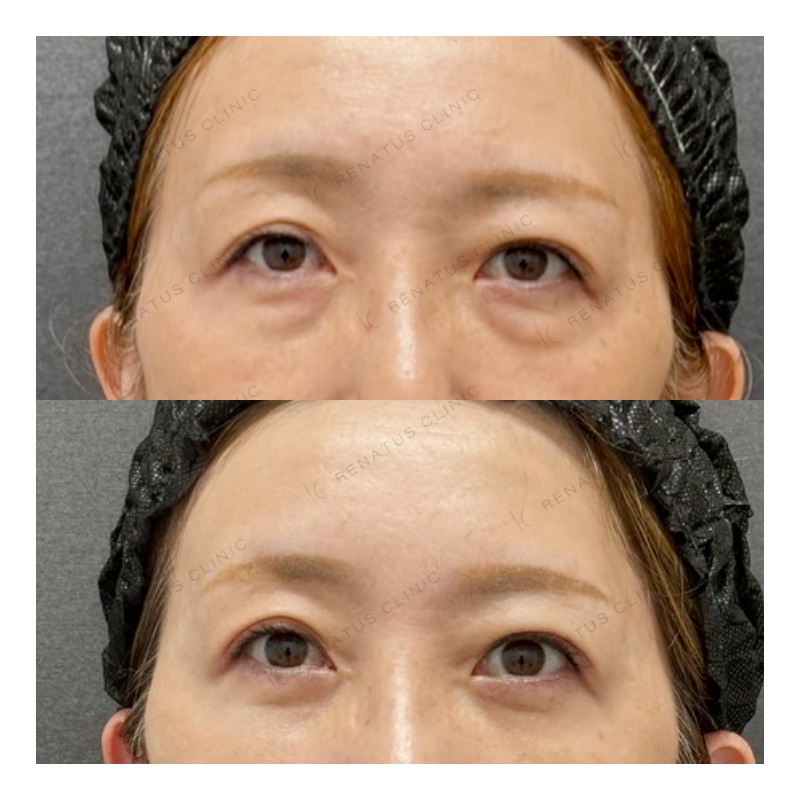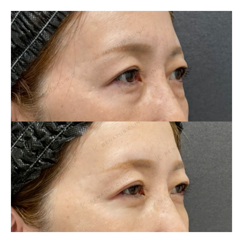 A:注射による内出血や腫れが数日〜1週間程度出る場合があります。目元は特にデリケートな部位のため、施術後はなるべく触らず、サングラスやコンシーラーで対応される方が多いです。激しい運動や飲酒は数日控えることをおすすめしています。