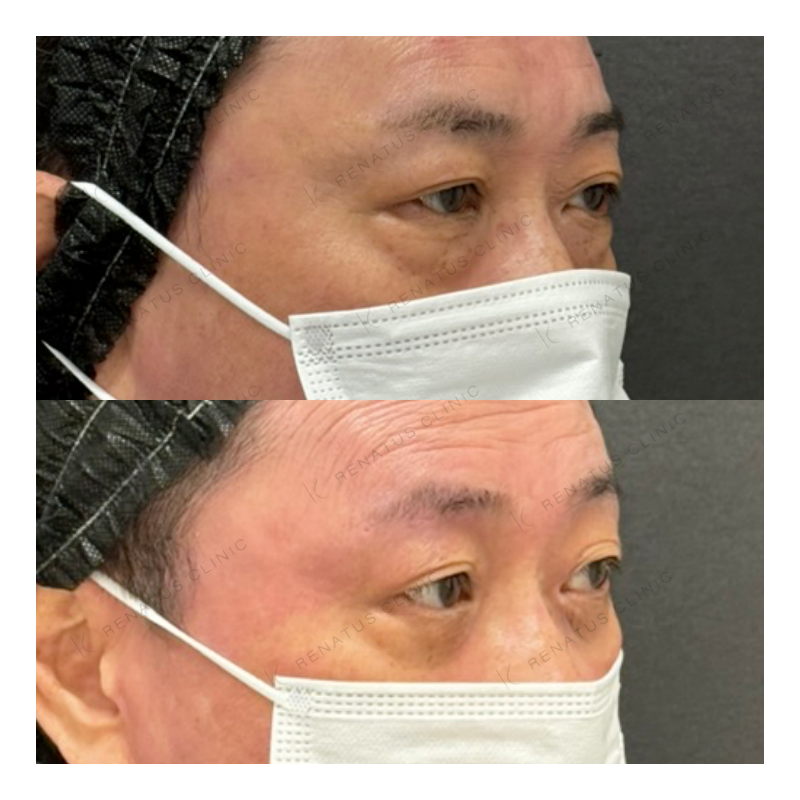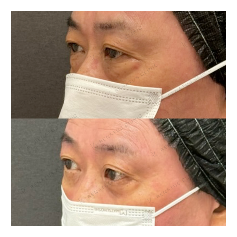 目の下のクマ取りにヒアルロン酸を用いる際は、眼窩縁のくぼみに対して適切な深さ・量をコントロールすることが自然な仕上がりの鍵となります。当院ではティア・トラフ(涙袋下のくぼみ)の形状を丁寧に評価したうえで、柔軟性・持続性に優れたヒアルロン酸製剤を骨膜上レベルへ精密に注入し、不自然な膨らみが出ないよう細心の注意を払っています。40代男性特有の皮膚の厚みや骨格変化にも対応したアプローチで、疲れた印象を根本からリセットするお手伝いをいたします。